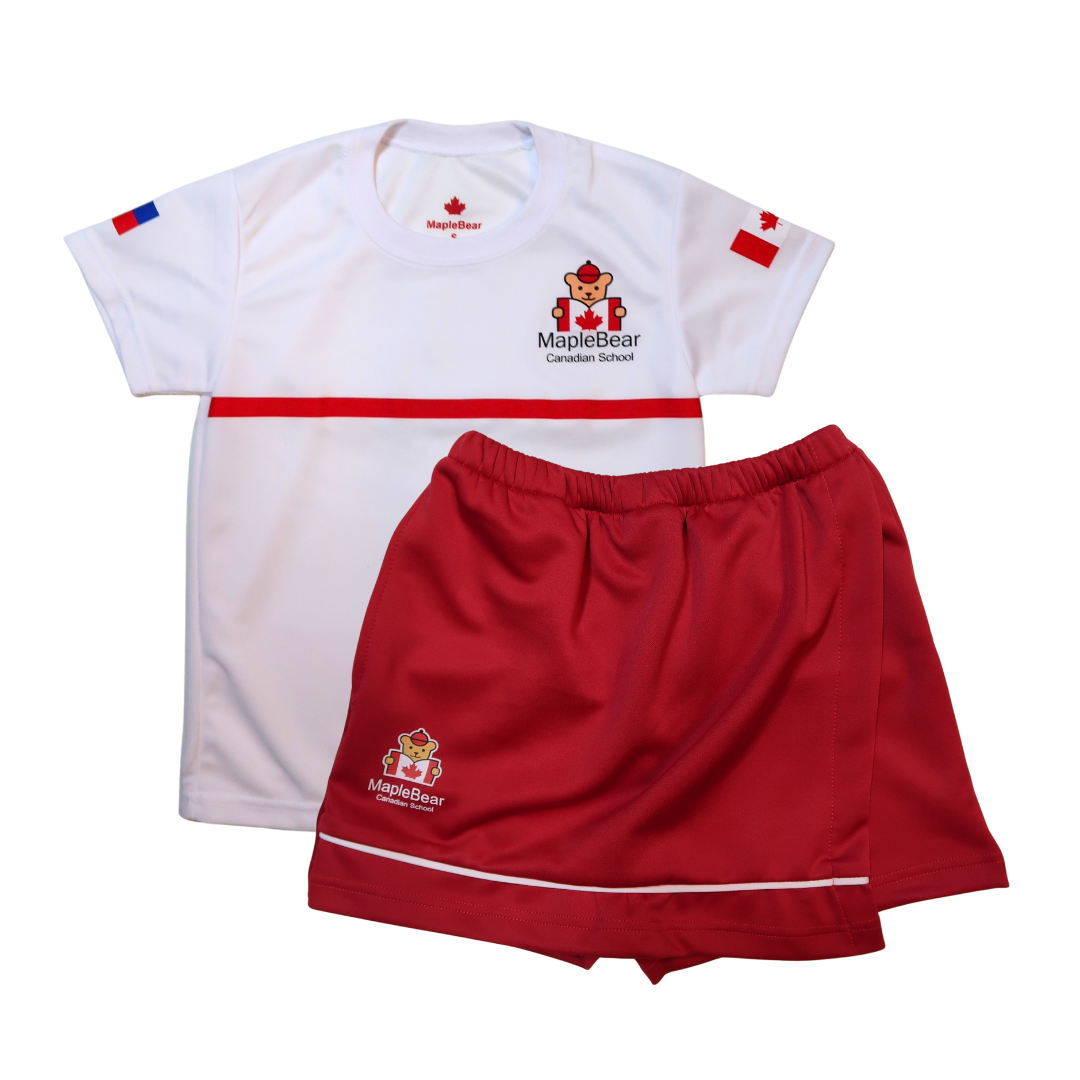 White Dri-Fit shirt and red skirt/shorts with MapleBear Canadian Preschool Logo.